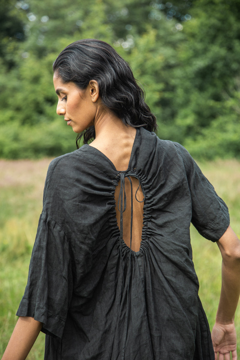 The Monique dress is a statement style with a minimal front and a cutout drawstring detail at the back.