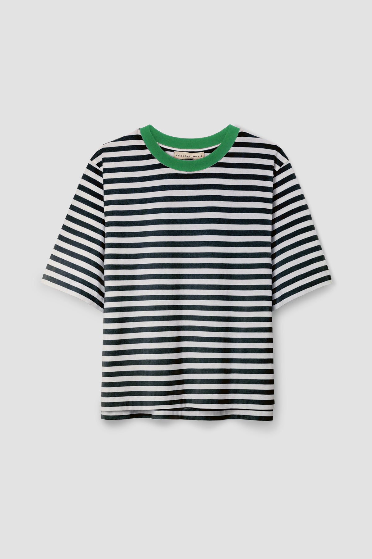 The Bay-Sue is a boxy fit T-shirt with a ribbed contrast collar, dipped hem and wide sleeves.