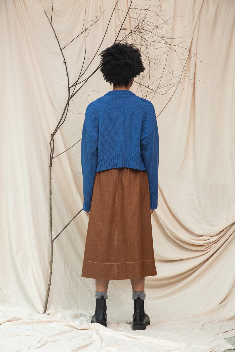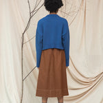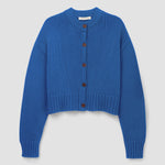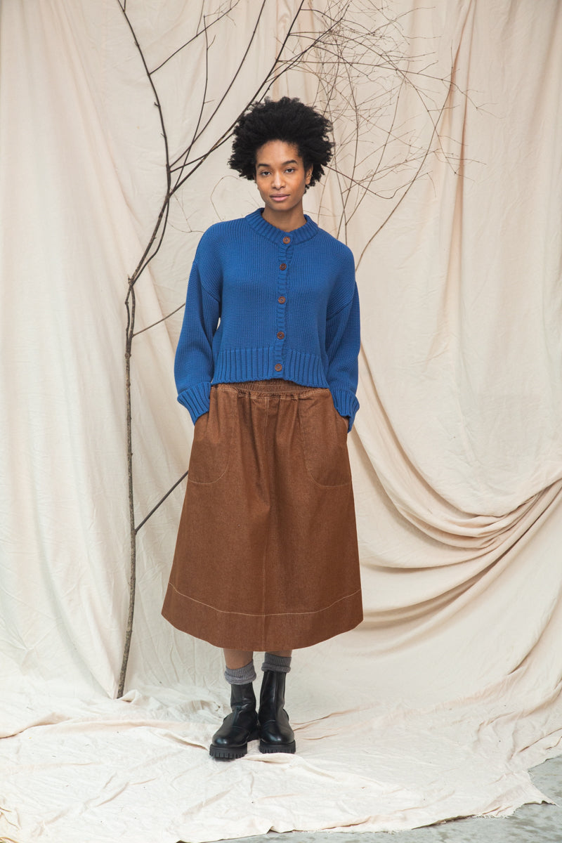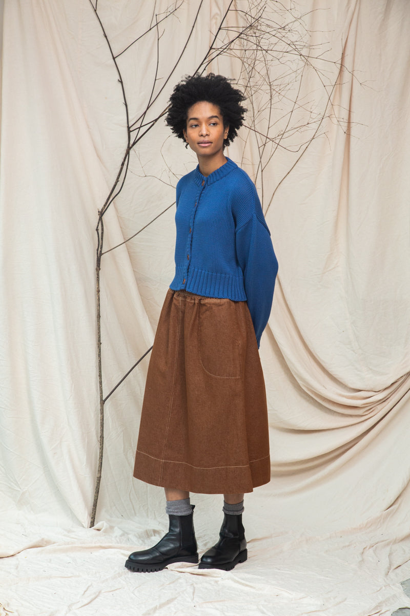 The Sugi is a cropped boxy cardigan with a button down placket and rib knit detail to the collar, cuffs and hem.
