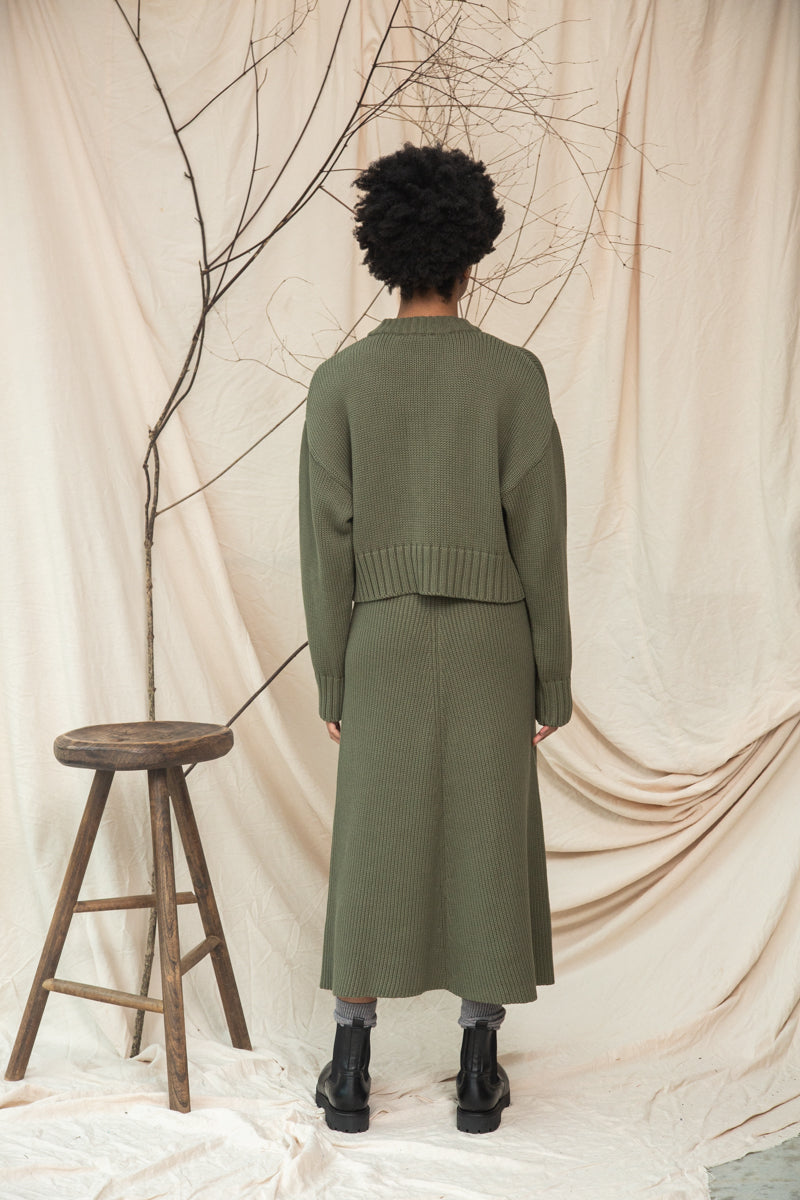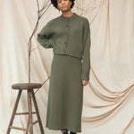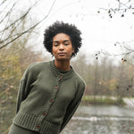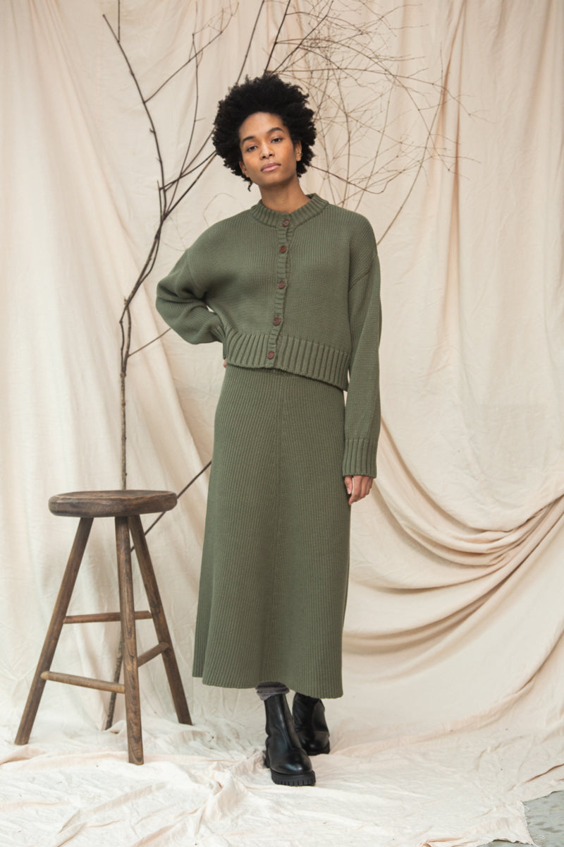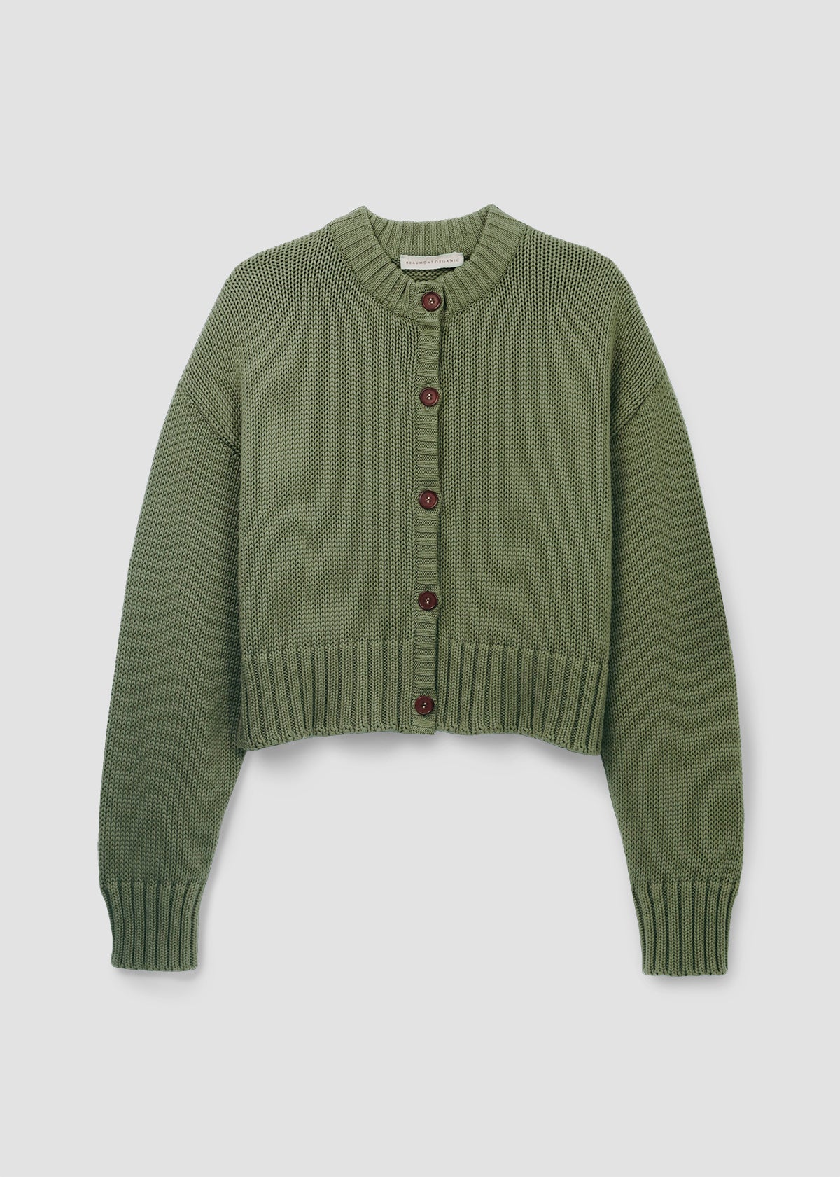 The Sugi is a cropped boxy cardigan with a button down placket and rib knit detail to the collar, cuffs and hem.