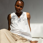 The Azure Vest is a loose fitting vest with a V-neck and cute elasticated detail under the arm.