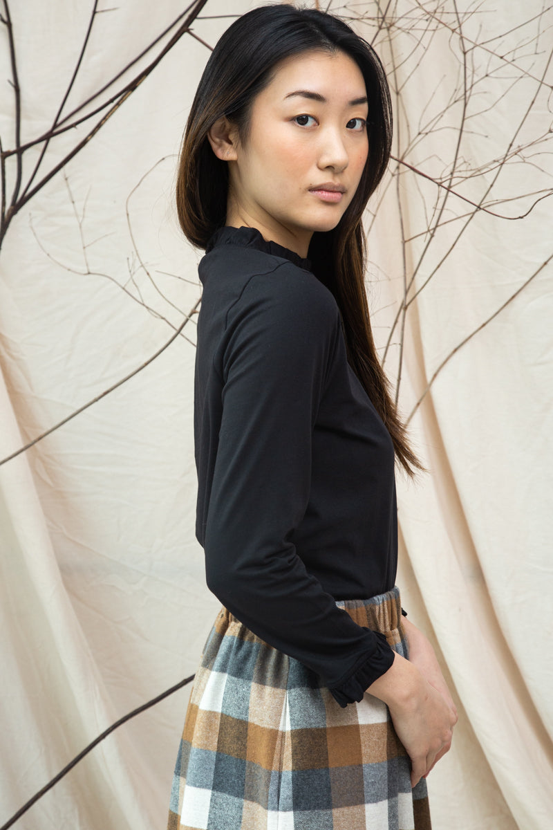 The Pearl is a long sleeved top with a subtle ruffle detail at the neck and cuffs.