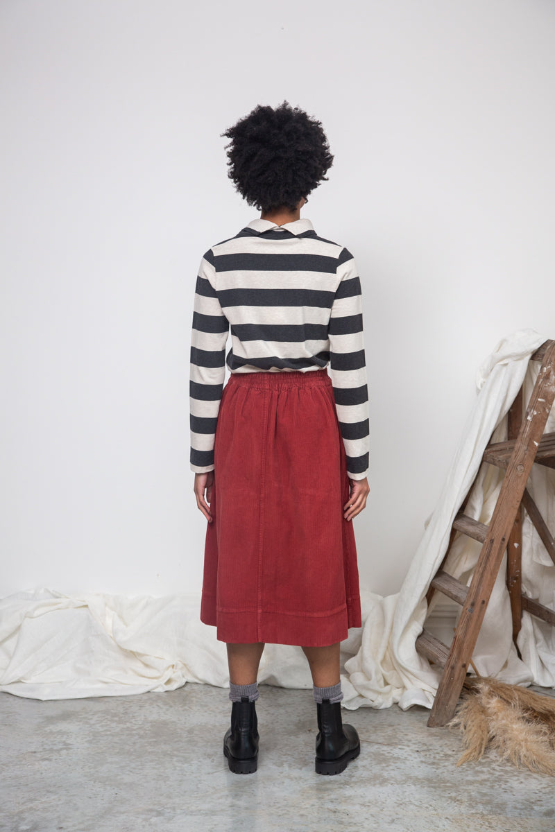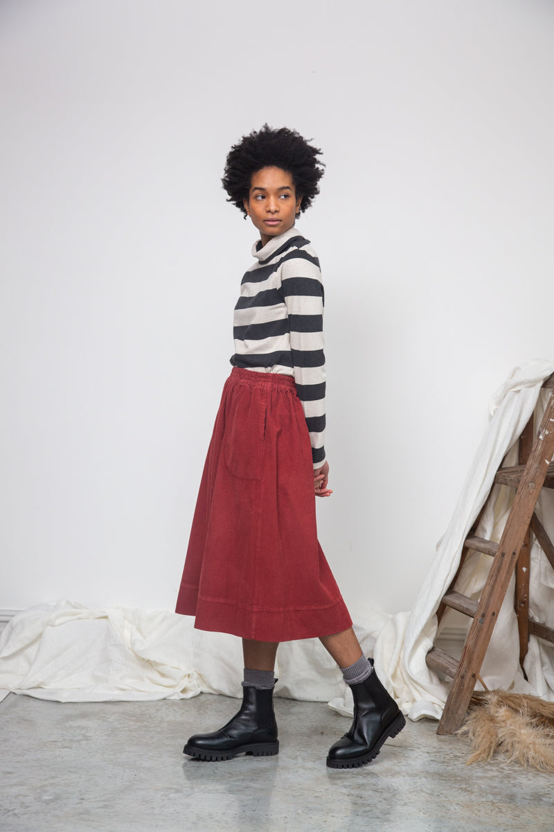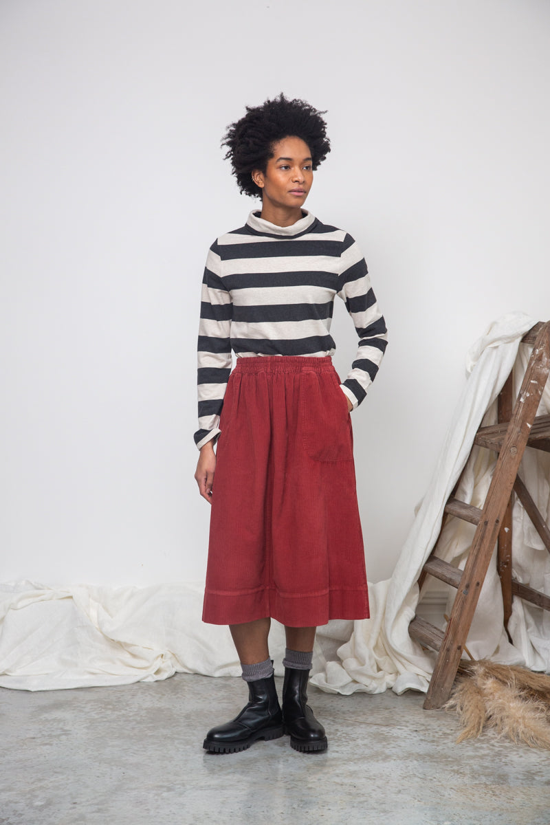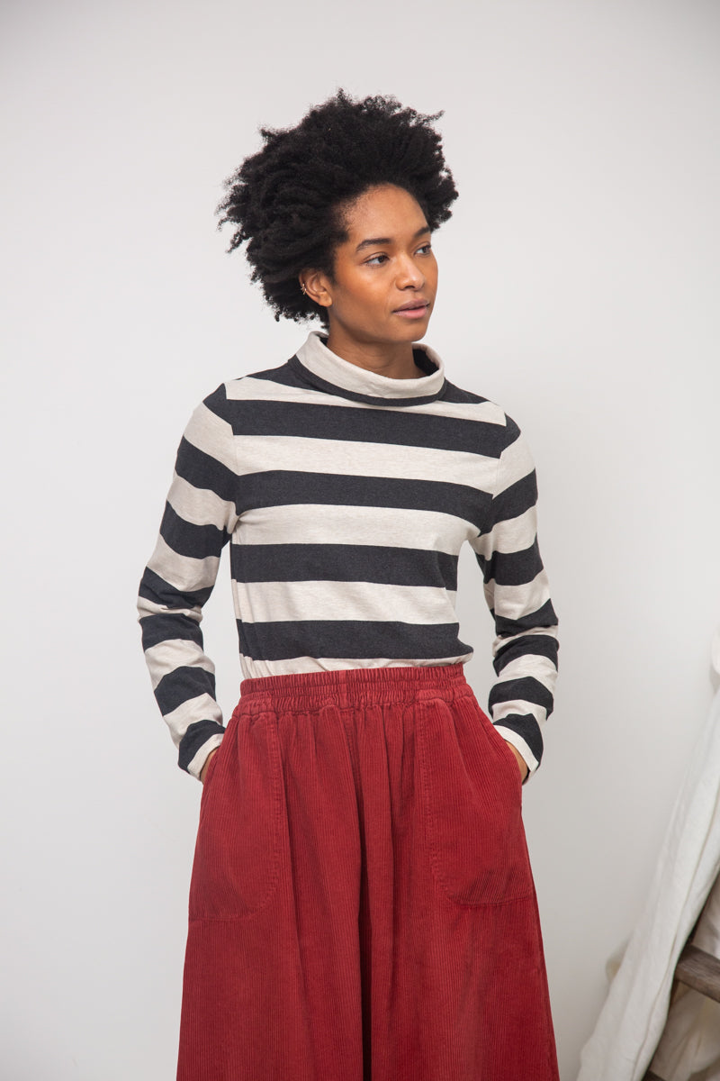 The Pine-Sue is a slimline roll neck top with full length sleeves crafted from our striped brushed jersey.