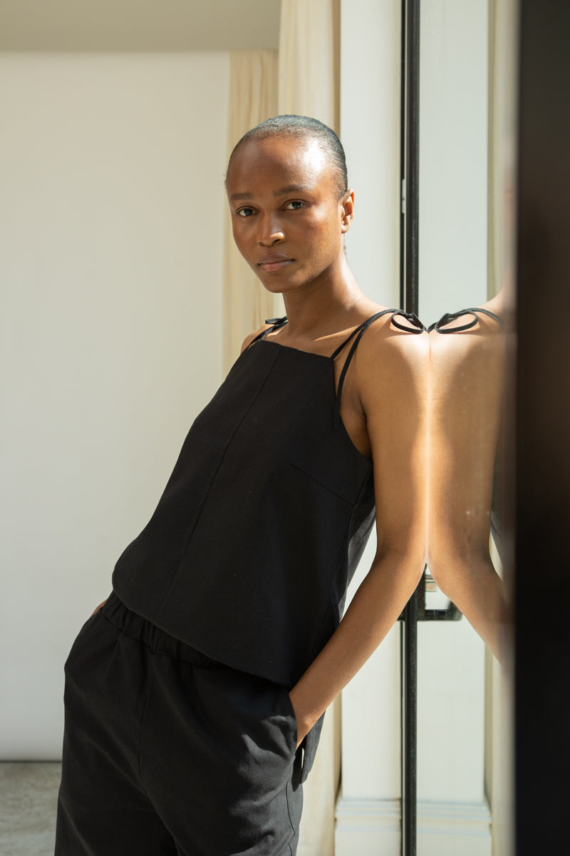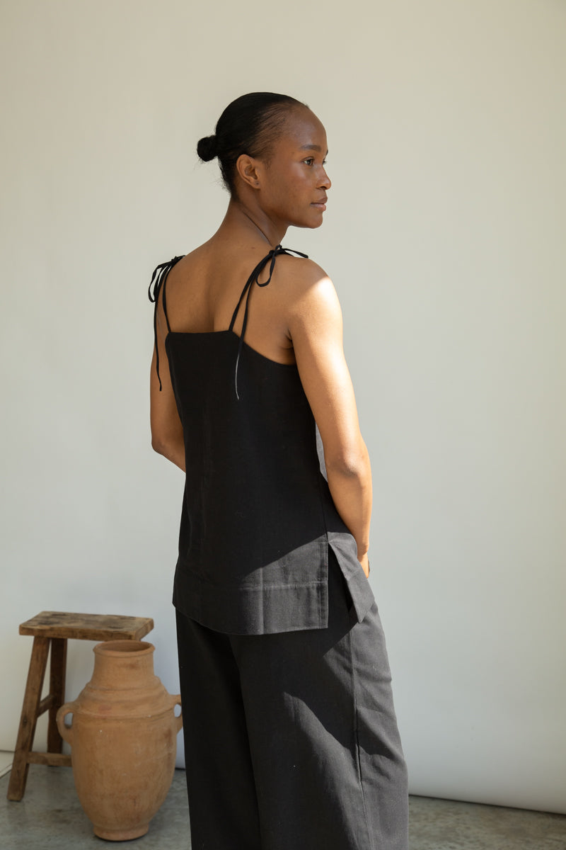 The Toni-May is a longer-line vest with shoulder-tie straps, a lower back and side splits. Crafted in our Organic Cotton Linen which keeps you cool during warmer climes.